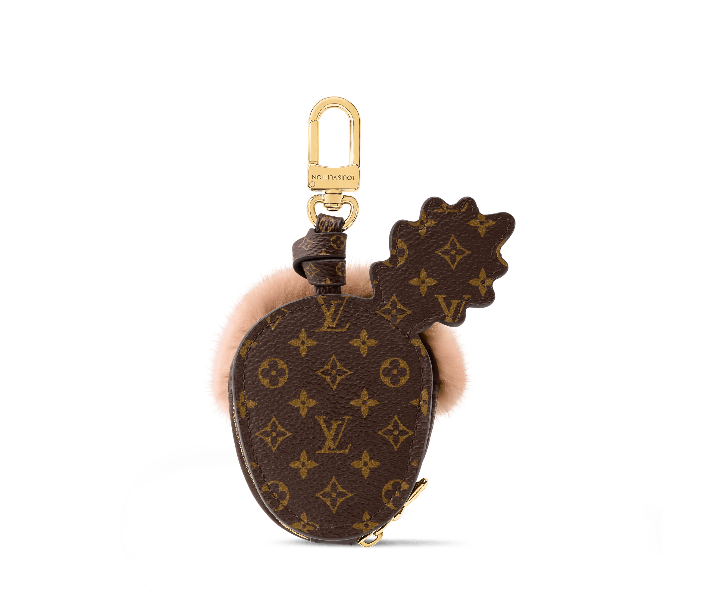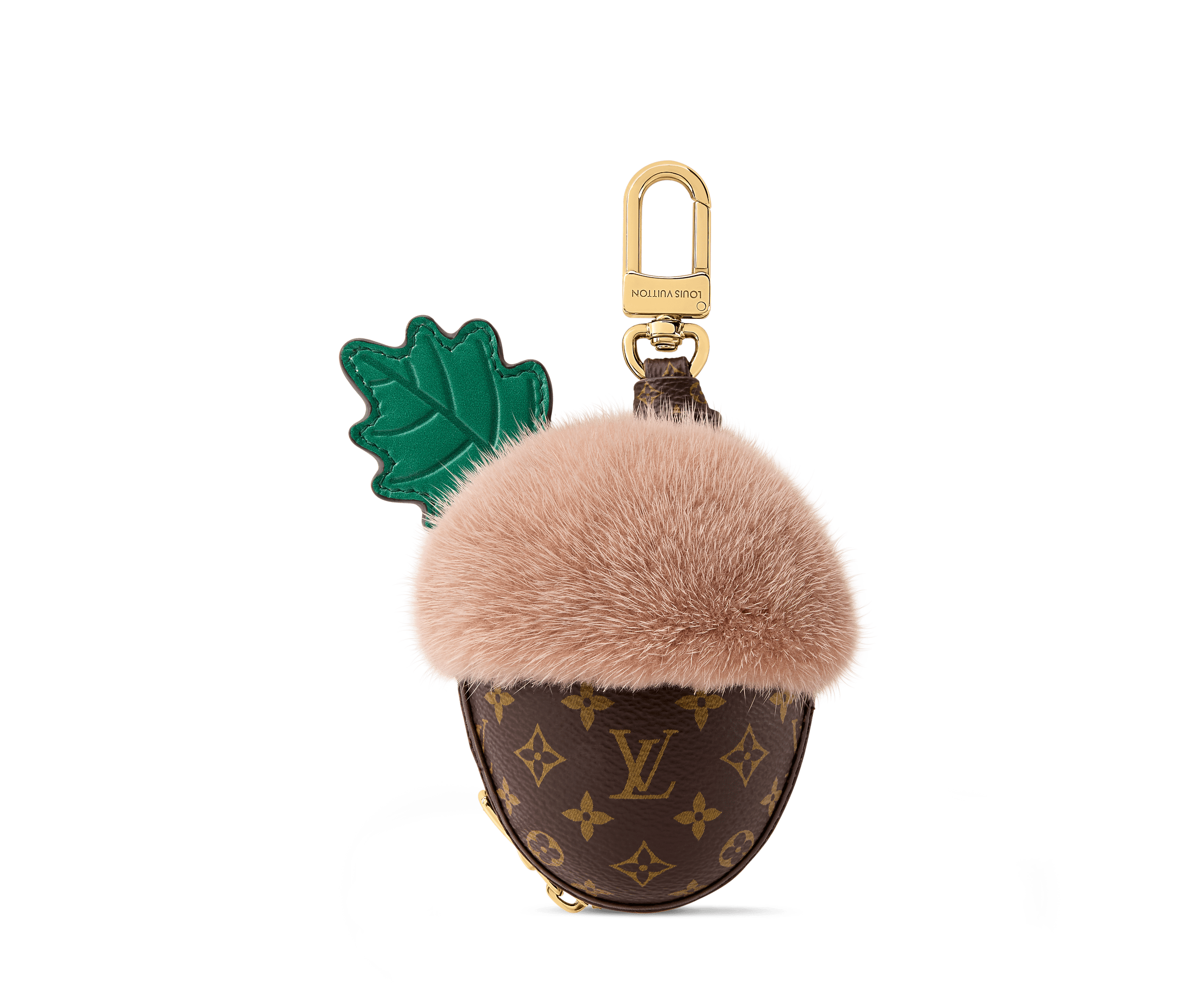 The eye-catching LV Acorn pouch offers a delightful combination of functionality and adorable style. A plump acorn crafted in Monogram leather is adorned with a colorful leaf and a cap in soft mink fur for a plush tactile effect. This unique bag charm is also a practical zip-up pouch, perfect for carrying earbuds and other small essentials.
