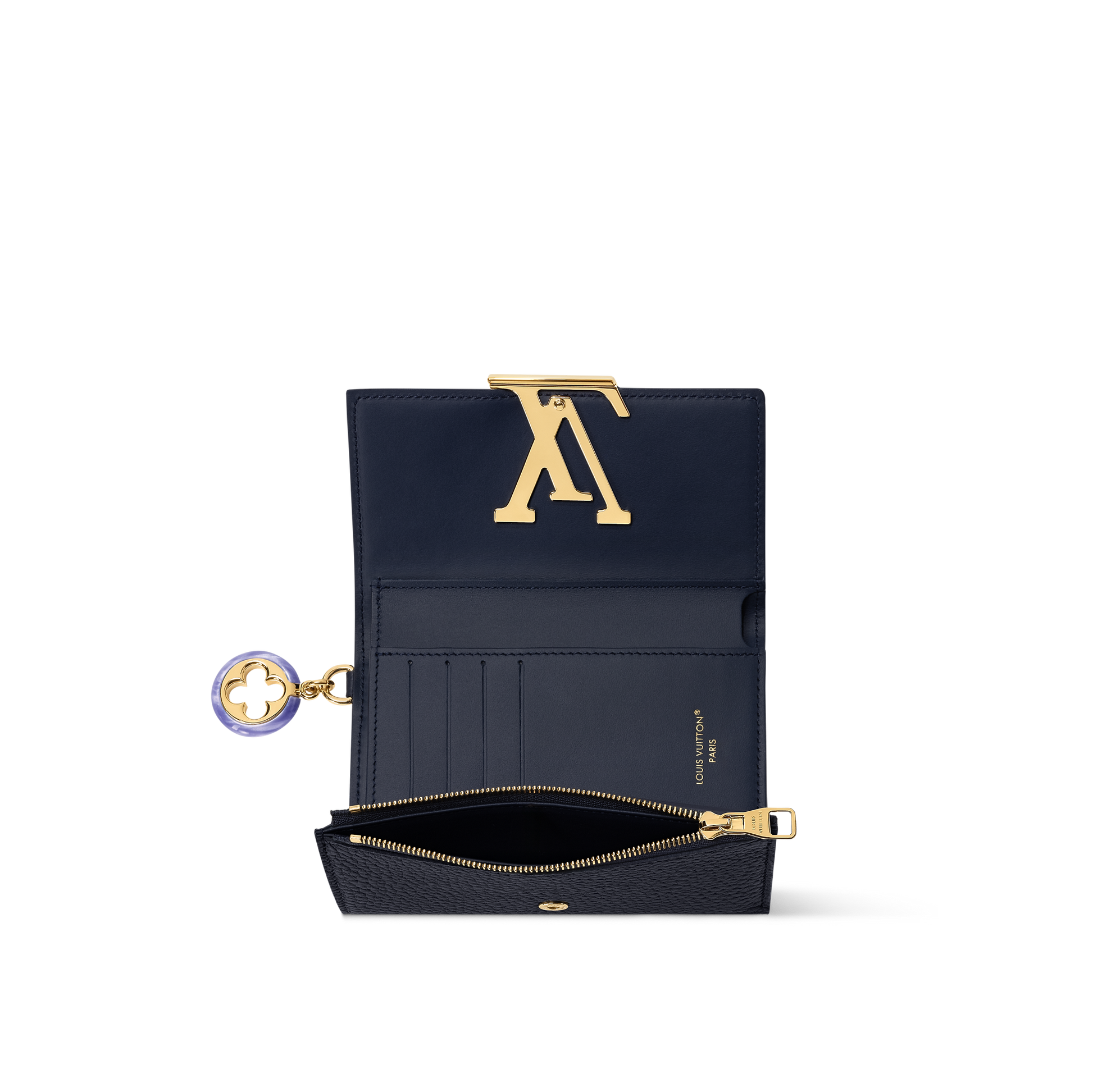 Inspired by the house's iconic Capucines bag, this Capucines wallet is crafted from Taurillon leather in an elegant Navy Blue. Part of the Harmony collection, it is adorned with Monogram flower and LV logo in Resin of the same color. The compact design fits easily into many types of bags and has multiple compartments and convenient card slots.