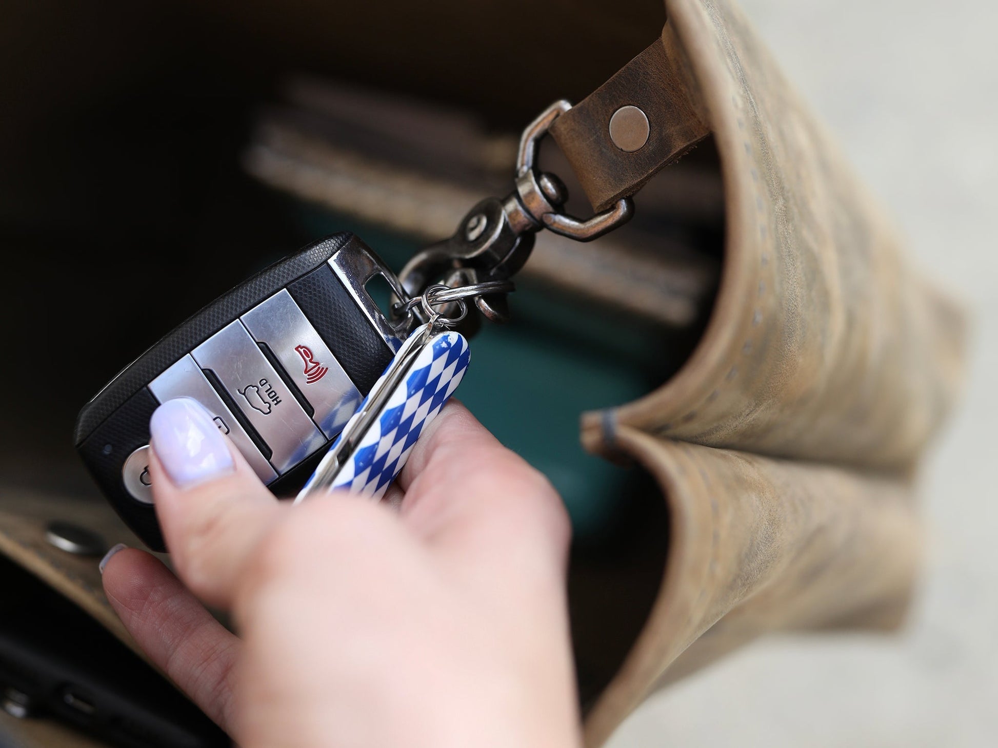Sturdy belt weight English Bridle straps for comfortable shoulder carry. An interior pocket and a key clip keep things organized.